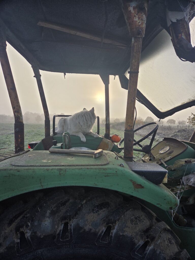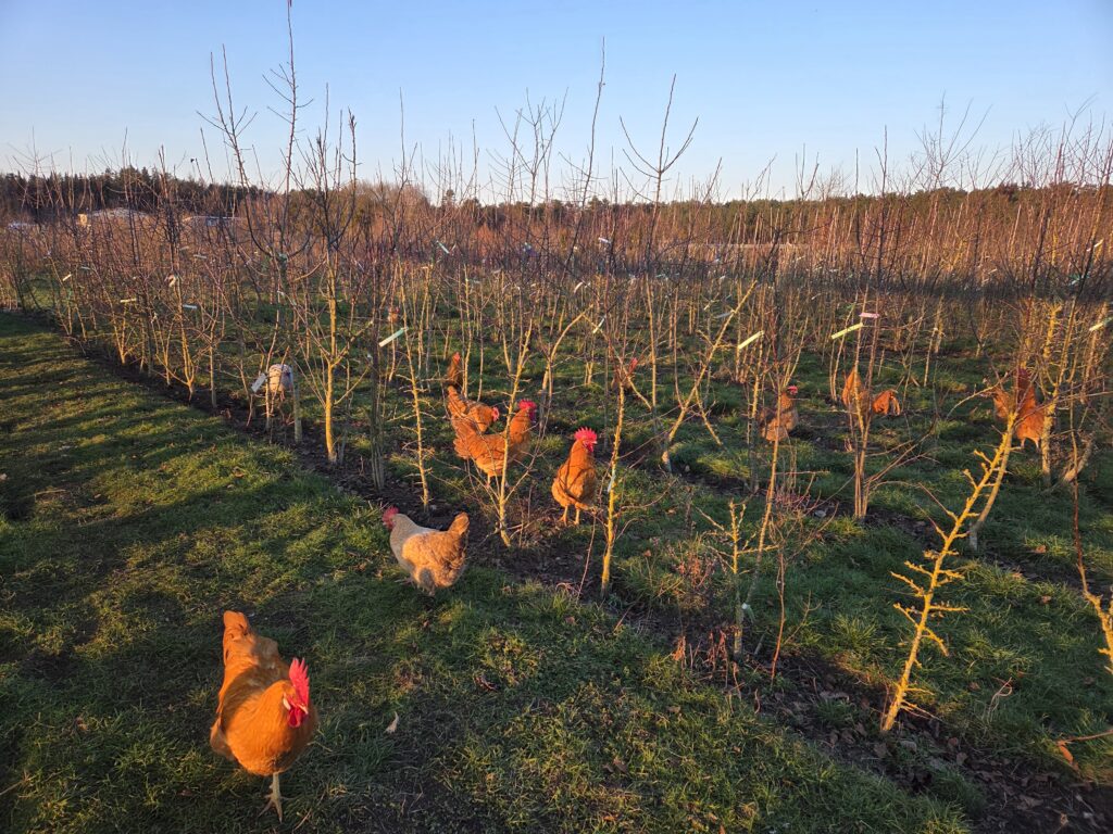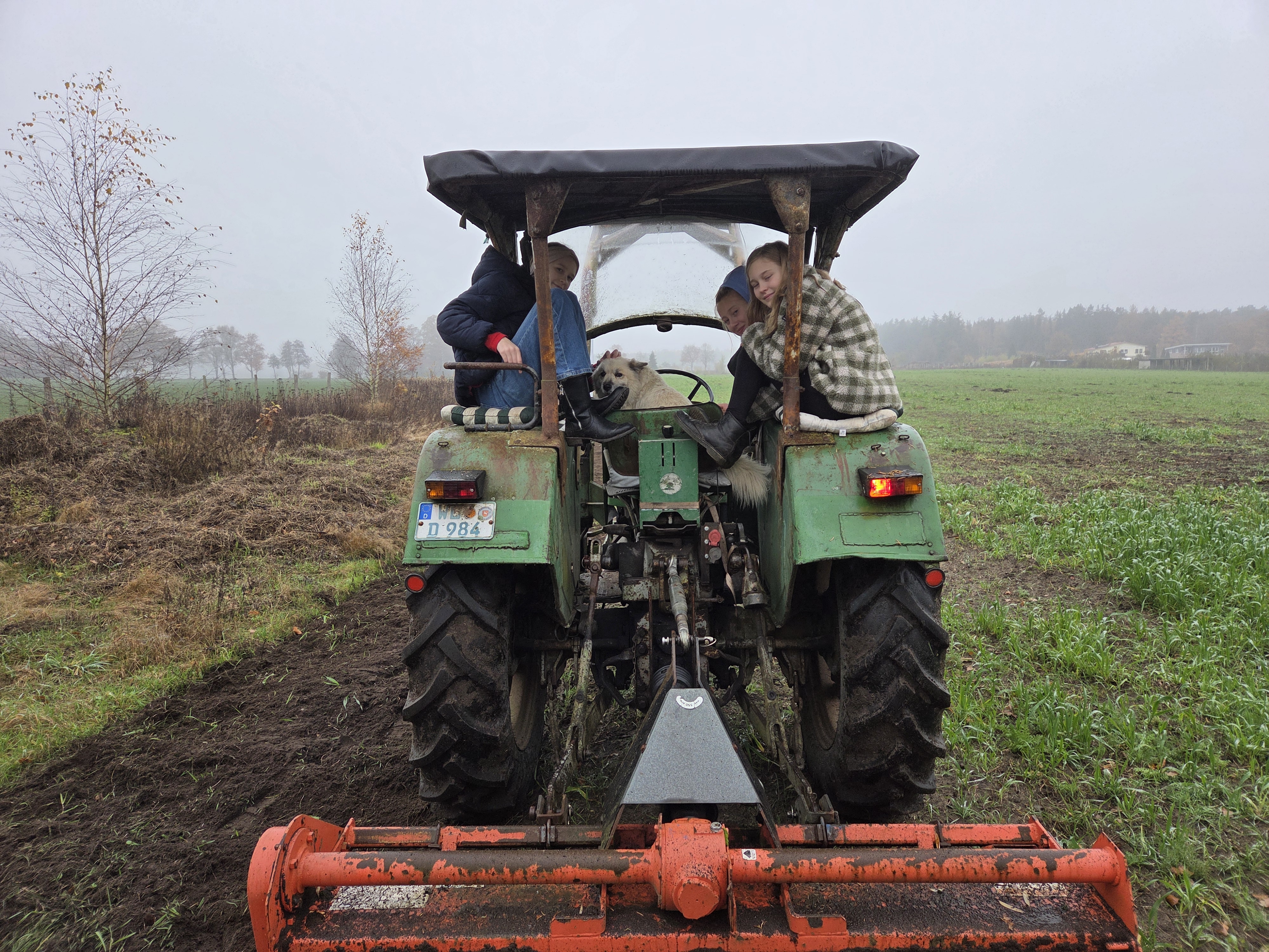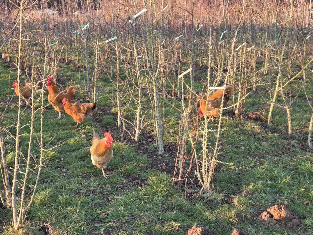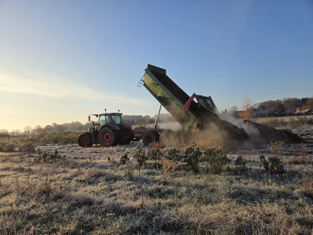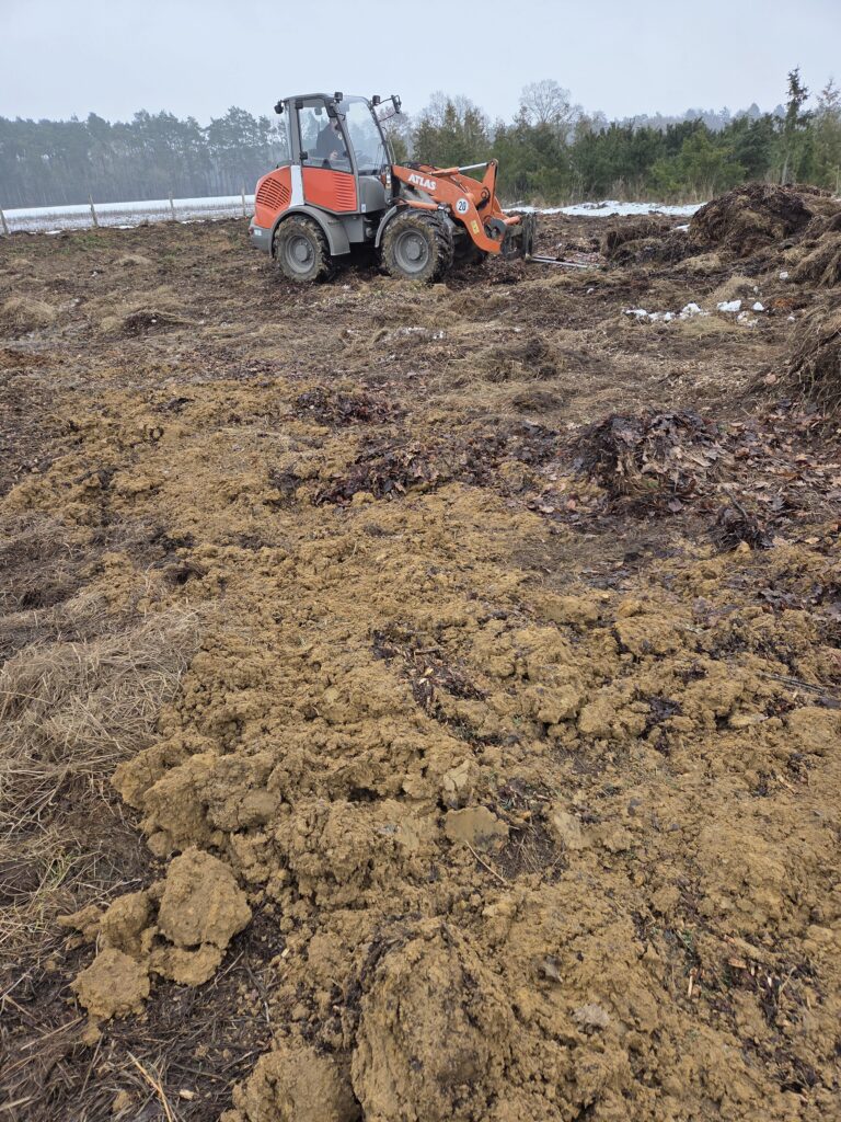 Die Quartiere werden für das Umpflanzen vorbereitet. Mit dem Radlader wird eine Schicht aus Schredder, Mist und Lehm verteilt und geglättet. So langsam wird unser Heidesandboden immer fruchtbarer. Diese Mischung hält die Feuchtigkeit und so kann vom Regenwurm bis zum kleinen Bakterium das Bodenleben die Nährstoffe freisetzen. Auch die Hühner mischen beim Umsetzen mit…..