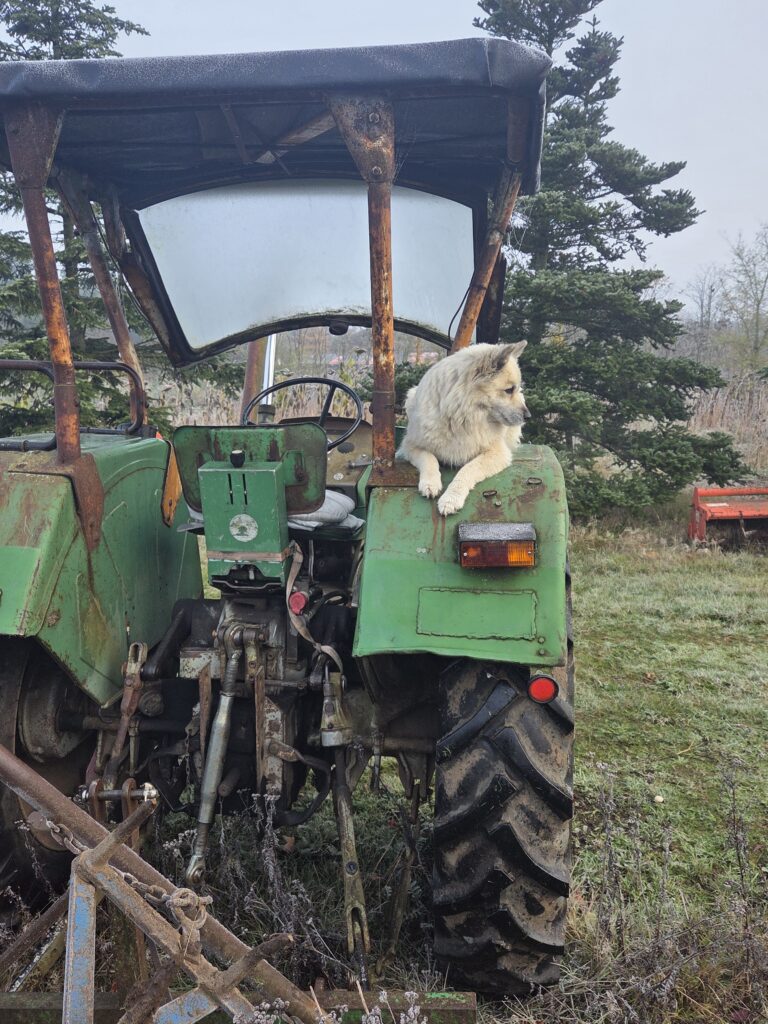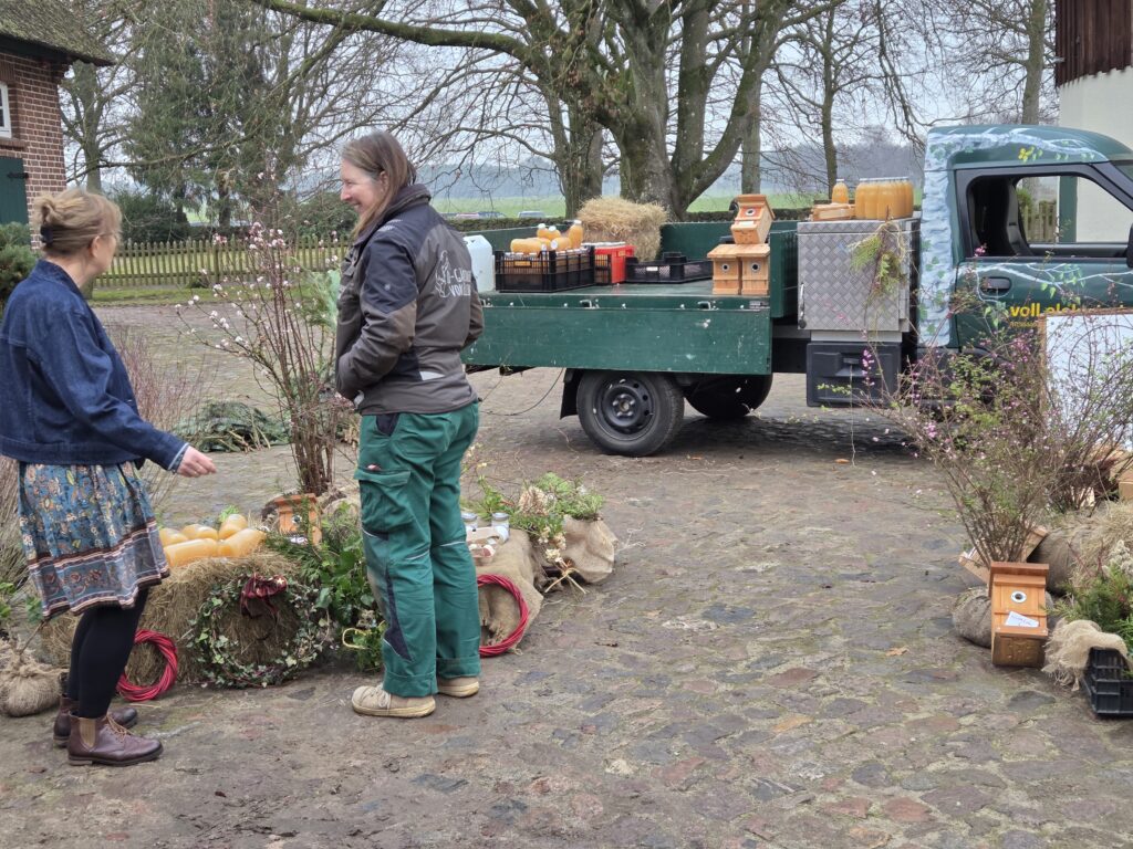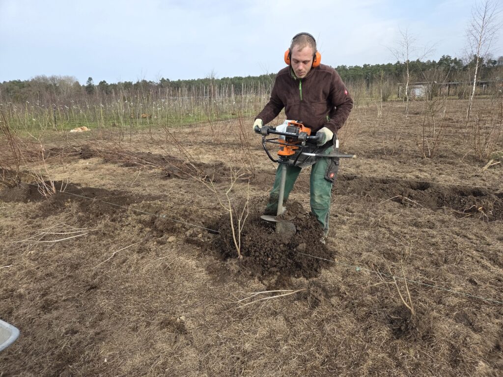 Heute bekommen wir von einem Nachbarn Pferdemist. Das ist eine Komponente der Bodenverbesserung. Wenn eine Fläche frei wird, bringen wir Holzhächsel, Heckenschnitt, Laub und Kompost aus, wenn wir welchen bekommen eben auch Mist und dann noch Lehm. Der ist ganz wichtig, sonst bildet sich kein Dauerhumus. Aber so kommen die Regenwürmer und viele andere Helfer im Boden und dann können deutlich mehr Wasser und Nährstoffe gespeichert werden — auch auf unserem Sandboden!