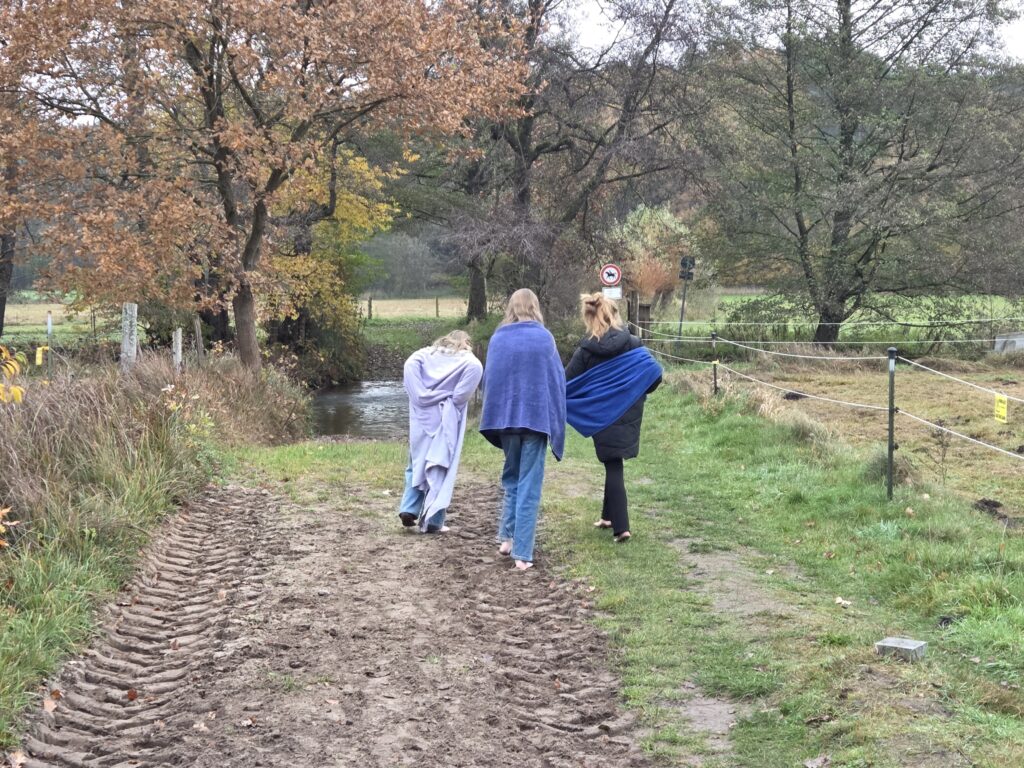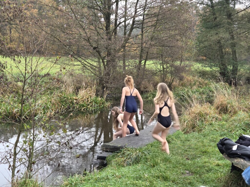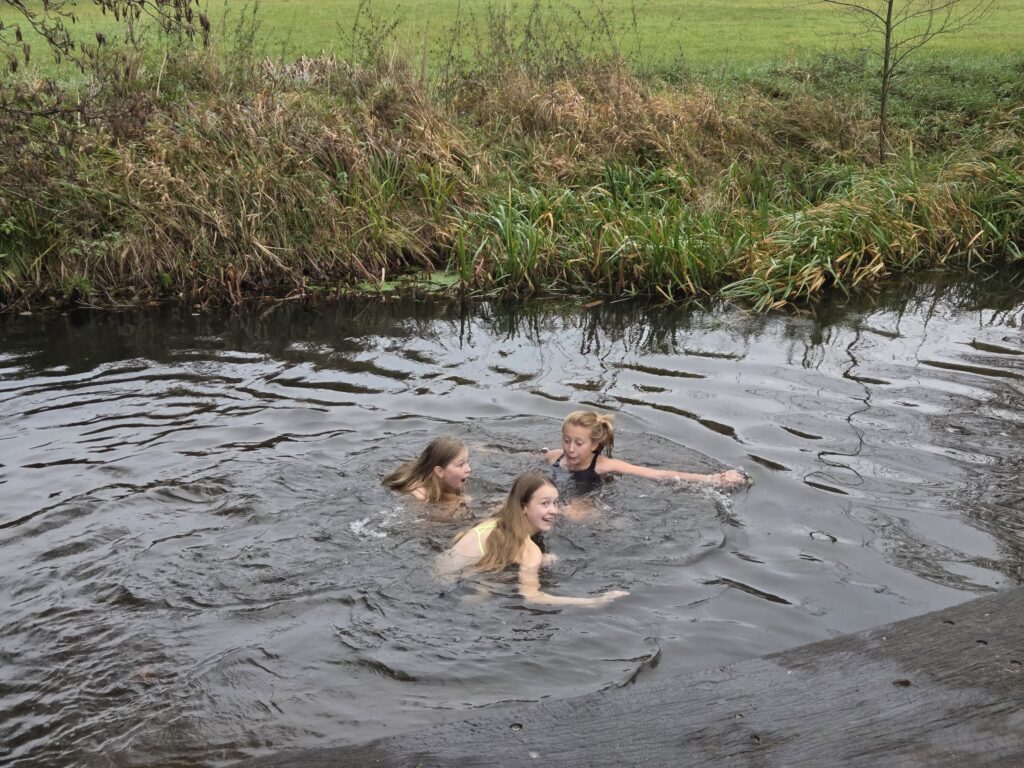 Unsere Enkelin Julika ist mit zwei Freundinnen aus Hamburg gekommen, um ihren Geburtstag nachzufeiern. Ausser dem normalen Landleben wie Hunde streicheln, Hühner füttern, Stockbrot etc., gab es noch eine Wette: trauen sich die Mädels in die kalte Aue?