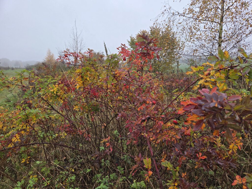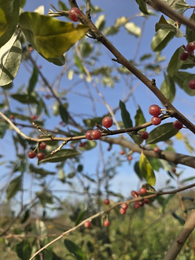 Auch Mitte November können wir noch leckere Früchte ernten: die Ölweide Elaeagnus umbellata hat zwar kleine, aber sehr gesunde Früchte- und das so spät im Jahr! Warum die Vögel uns die dieses Jahr nicht alle weggeschnappt haben, weiß ich nicht…