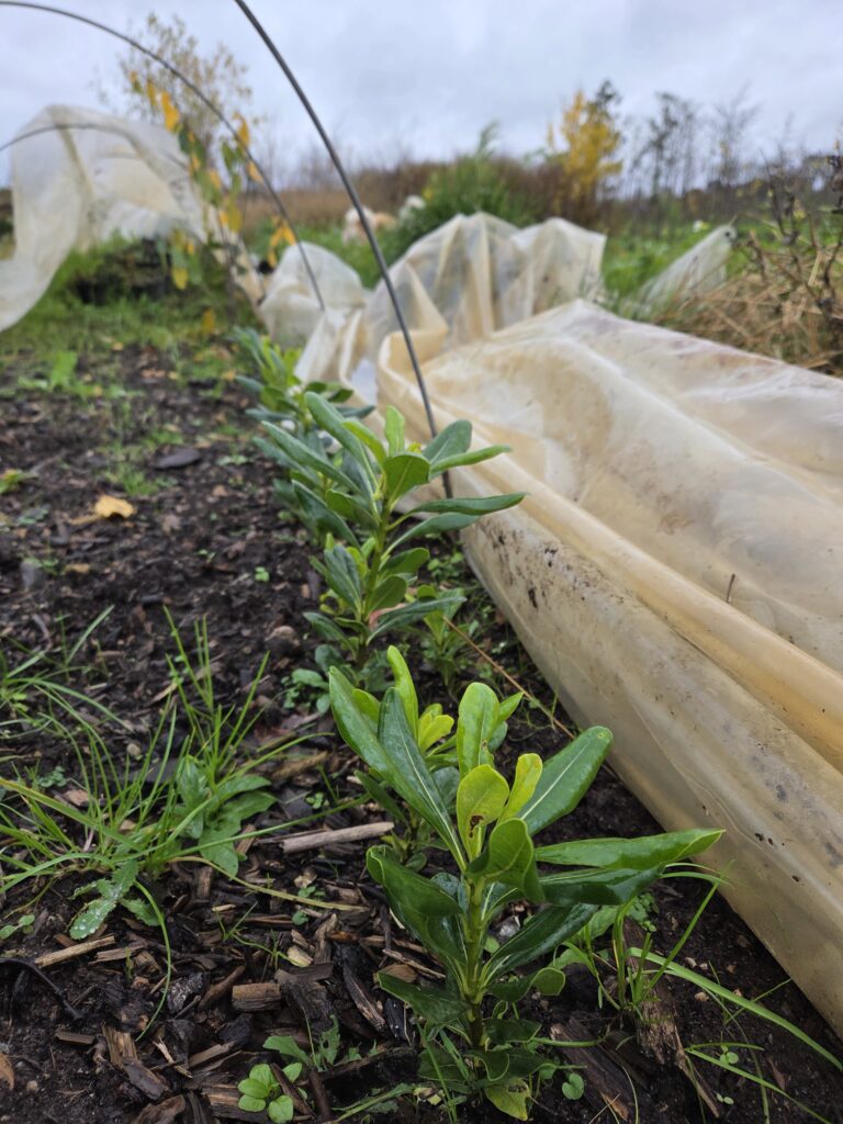 Jetzt soll’s wieder Frost geben….Der Folientunnel über den Sämlingen von Klebsame ( Pittosporum Tobias), Steineiche (Quercus ilex) und einer Ingwerart wird geschlossen. Die Saat haben wir letzten Winter aus Spanien mitgebracht. Mal sehen, wie die Jungpflanzen den Winter im Klimawandel überstehen…