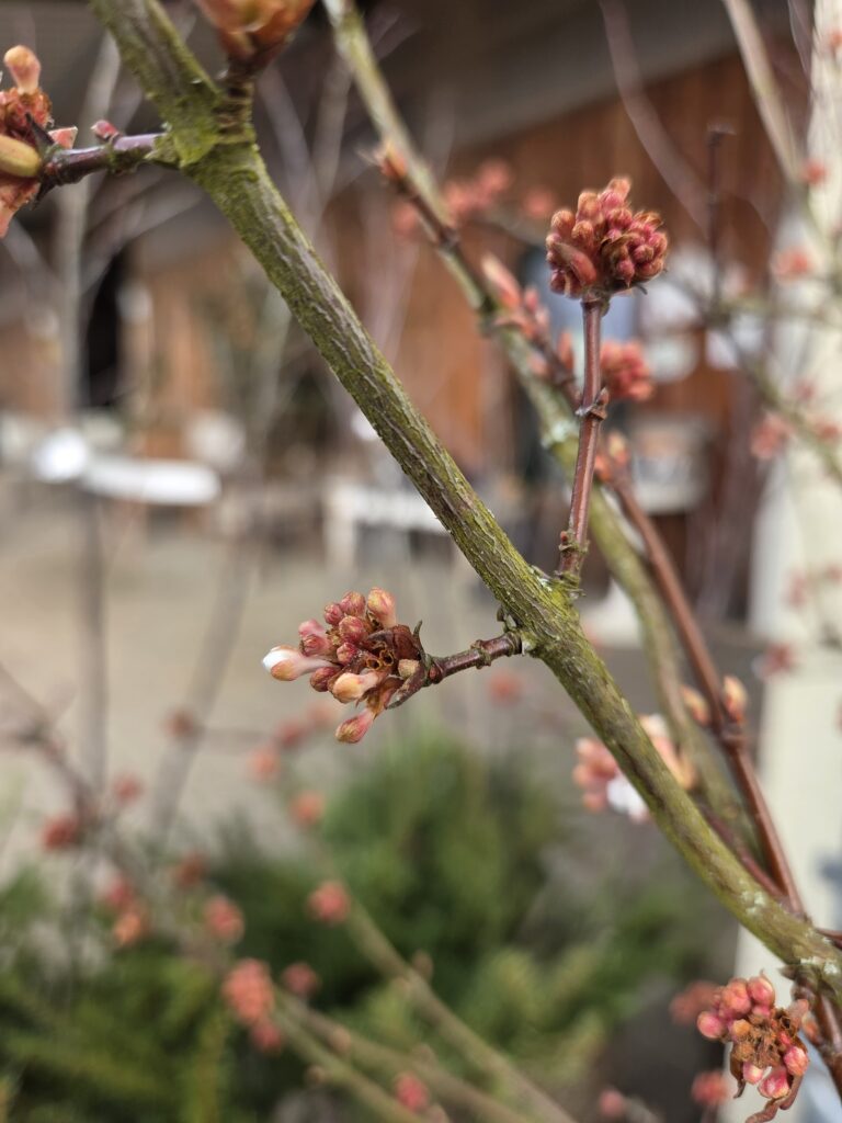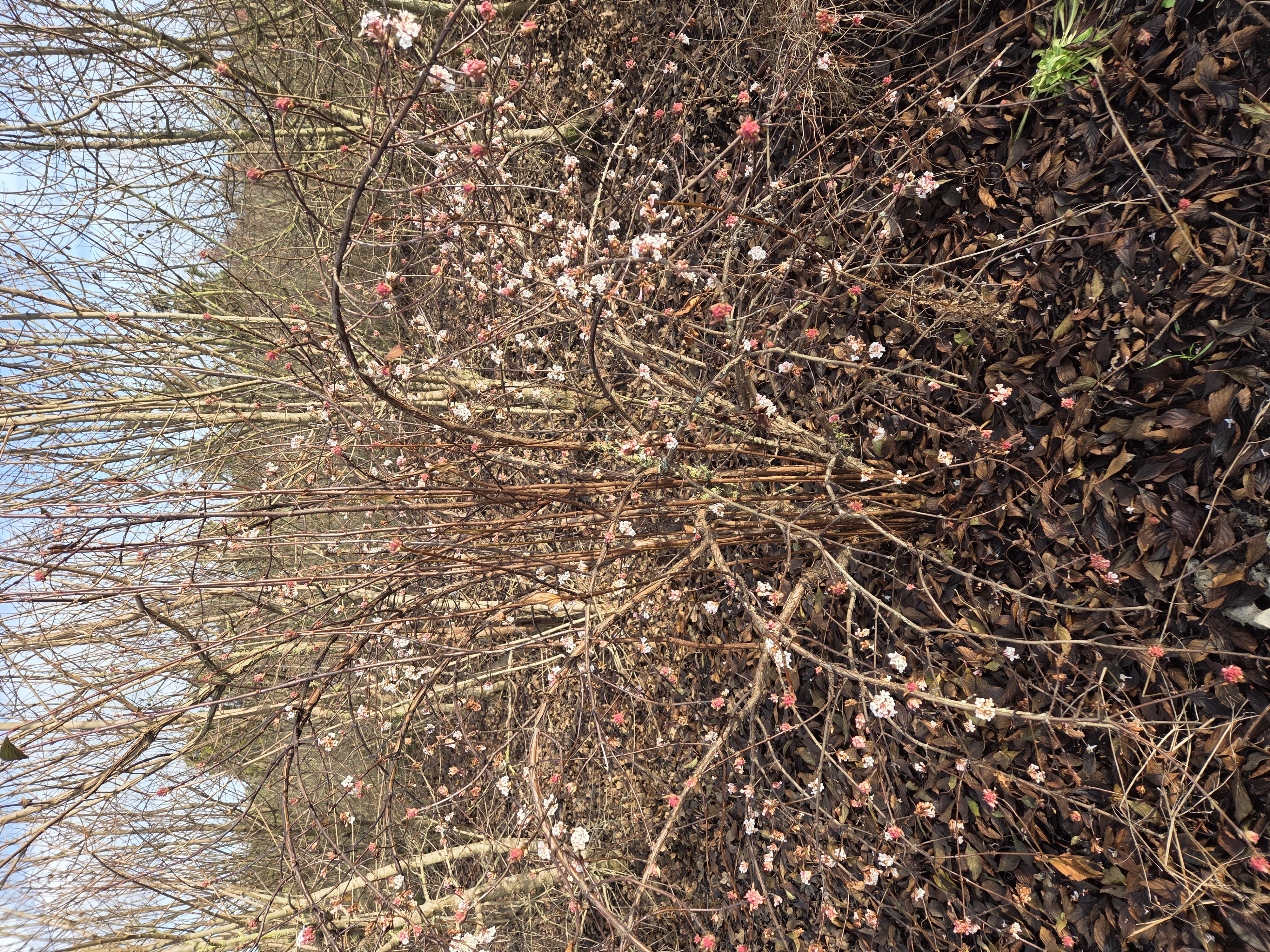 (Winterduftschneeball Viburnum farreri. Blüht, wenn es nicht friert, den ganzen Winter. Und wie der Name schon sagt: er duftet sehr angenehm, manchmal einige Meter weit zu riechen. )