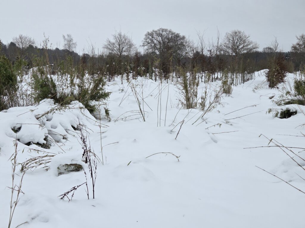 Der Bambus ist unter dem Schnee verschwunden, steht aber bei Tauwetter wieder auf…