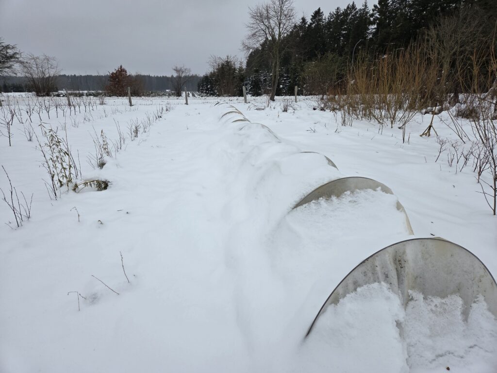 Mal sehen, ob die Sämlinge aus dem letzten Winterurlaub ( Ilexeichen, Klebsame und Ingwer) unter dem Tunnel und Schnee überlebt haben..