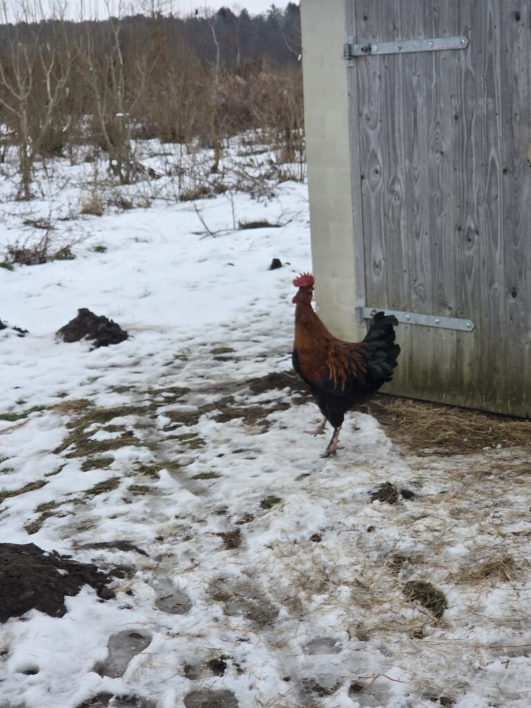 Unsere vielen Hähne….. etwa 35, aus der Brut vom letzten Jahr, müssen geschlachtet werden. Das hätte eigentlich schon Ende letzten Jahres passieren müssen- aber da war Aufstallpflicht wegen der Vogelgrippe und auch transportieren und schlachten war verboten. Man kann so viele Hähne nicht bei den Hennen lassen. Die Hähne, wenn sie auf die Hennen steigen, treten zuerst die Federn weg und wenn die als Schutz nicht mehr da sind, zerschneiden sie den Rücken der Hennen mit ihren Sporen. Die Hähne sind untereinander relativ friedlich. Es gibt immer wieder kleine Zickereien und leider auch Vergewaltigungen und fieses Mobbing. Das Opfer seht ihr auf dem Foto. Der traut sich nur noch aus seinem Versteck, einem Legekasten, wenn kein anderer Hahn in der Nähe ist. Jetzt füttere ich ihn alleine…..