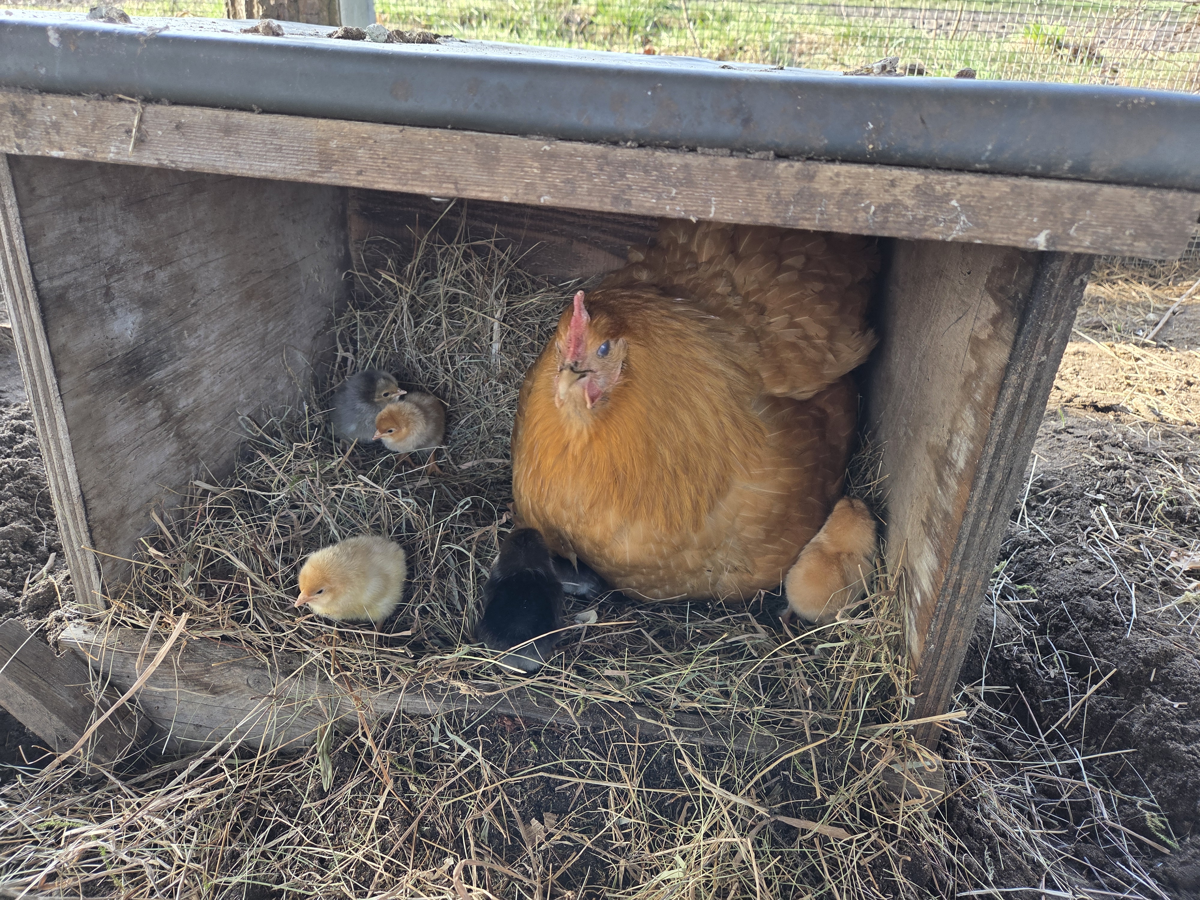 Eine ganz freundliche Henne versucht seit etwa 2 Wochen zu brüten….jetzt soll sie ihren Willen haben. Wir putzen einen alten Kaninchenstall, bringen eine Schicht Schredder ein und bauen ein Nest aus Heu. Dann noch Gibseier reinlegen…